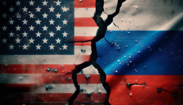Flags of USA and Russia on cracked surface. The juxtaposed flags of the United States and Russia appear on a worn and cracked surface, symbolizing geopolitical tensions