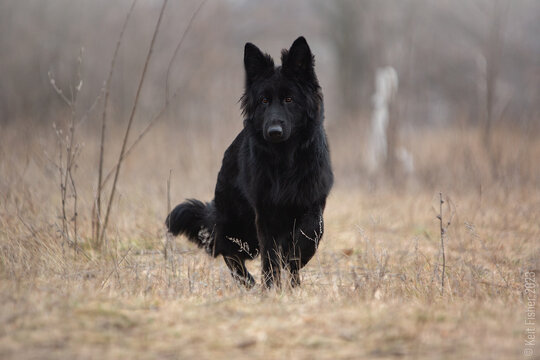 Beautiful black and tan german shepherd outdoor, green blurred background, green spring grass