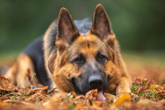portrait of old female german shepherd dog standing in field in daytime in autumn on forest background