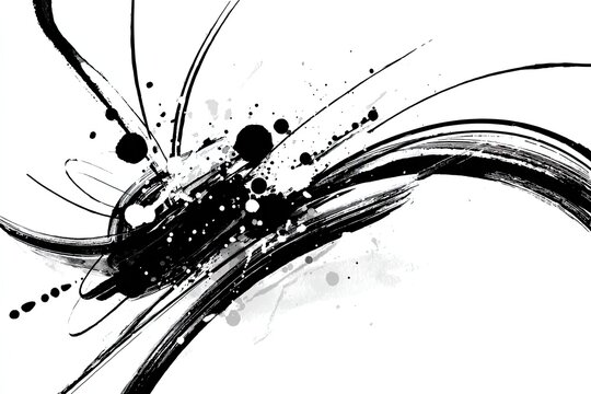 Abstract ink brushstrokes and splatters in black on white background, creating a dynamic composition