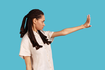 Road worker holds in hand red flag prohibiting traffic, travel restrictions, road repair, customs border transport control, reverse movement, no way sign, limited access symbol, stop movement gesture