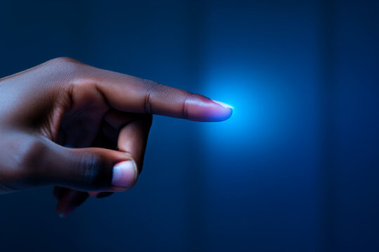 Right index finger pressing glowing holographic interface with futuristic circuit traces