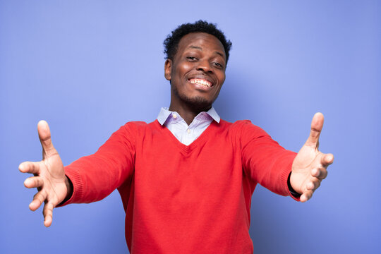 Young African American guy showing camera shape gesture with hands looking through at camera, picking best position for making picture