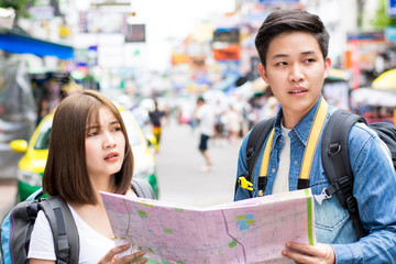 Exhausted and worried hiker in warm clothing sitting alone with backpack and hiking poles in nature on cold foggy winter day. He got lost during hiking.