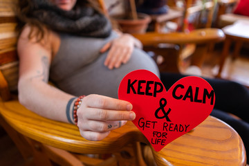 A close up view of a red heart shaped message in the hand of a woman in third trimester of pregnancy, saying keep calm and get ready for life, with blurry background