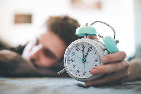 Alarm clock in the morning. Young man sleeps in the blurry background.