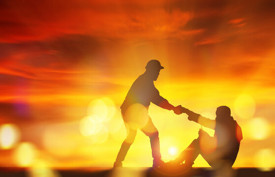 Silhouette engineer and male foreman pulling handshake, pulling the hand of a male worker who sits in despair, wanting to have a spirit of hope and stand up for success : Sunset background