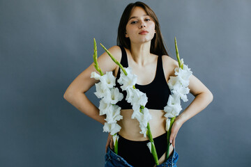 Portrait of a woman with gladioli flowers in her jeans