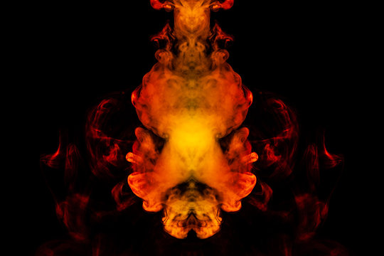 A blob of red and orange smoke in the form of a wavy pattern in the center of the frame depicting the head of a monster or an animal with eyes, not like a ghost or an animal