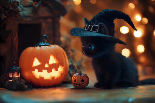 A black cat in a witch's hat, with a pumpkin on a Halloween background. A black, cute, fluffy kitten sitting near a carved Halloween lantern, creating a spooky night concept.