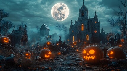 spooky Halloween graveyard scene, glowing jack-o'-lantern with sinister face, skull resting on old books, lit candles surrounding, foggy forest background