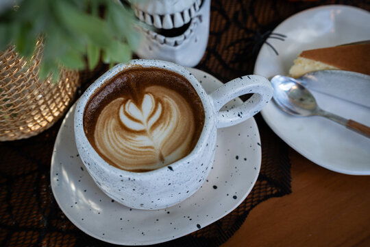 Enjoy a spooky Halloween latte with a ghost design, perfect for commercial seasonal marketing.