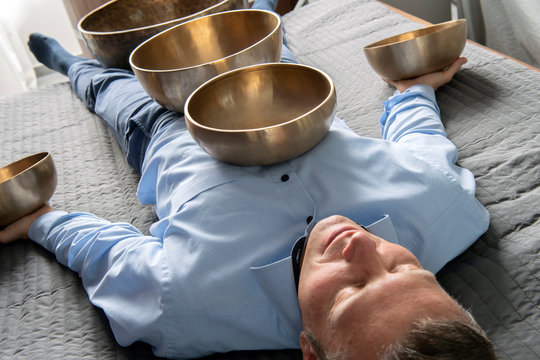 Ayurveda Therapie,  Klangschalen auf dem Körper, verteilt an den Energiezentren, Chakren