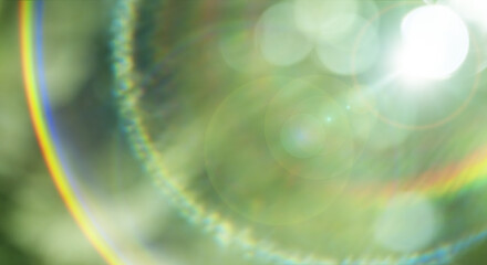 森の木漏れ日と日差し緑の背景 クリスタルのきれいなキラキラ光り輝く大小の明るいボケの回転の背景 自然・レンズボケ・効果・太陽・宝石・ウエディング・パーティーのイメージ レンズフレアとゴースト