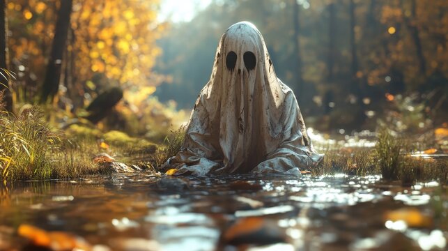 A faceless ghoul cloaked in spectral garb sits beside a stream, nestled in an autumn forest, surrounded by vibrant foliage that reflects its melancholic aura.
