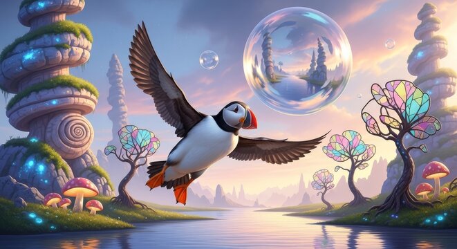 Whimsical bird flying through holiday-themed cloudscape