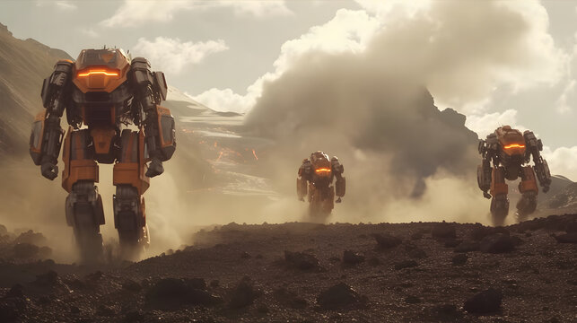 giant robot mechas running into a vulcanic landscape