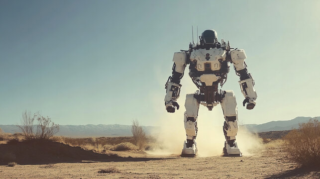 A large humanoid robot stands in a dusty landscape under clear skies, showcasing its engineering and design in a remote desert area
