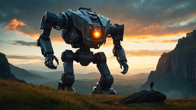 A giant futuristic mech robot in a mountainous landscape