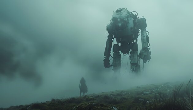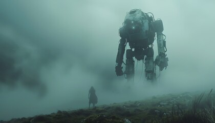 A giant robot stands in a foggy landscape. A woman stands in the foreground.