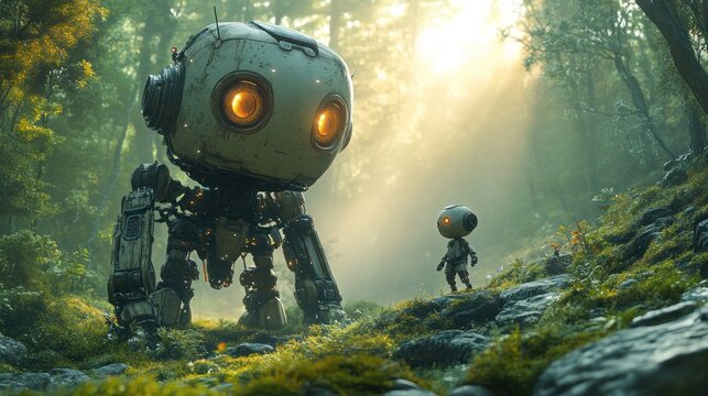 A giant robot and a small robot in a forest.