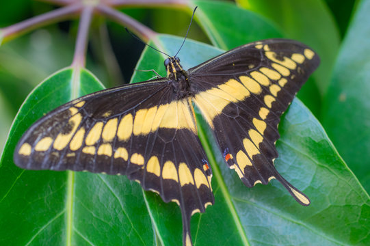 Giant Tiger Swallowtail Butterfly on Green Leaves with dark background