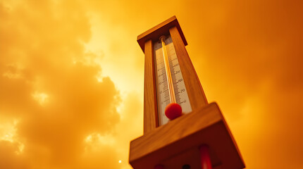 Dramatic Orange Sky with Wooden Giant Outdoor Thermometer Hot Temperature Weather