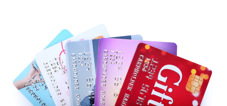 Hands of woman in red sweater holding credit card and gift box on white background close-up,top view,flat lay,copy space.Christmas and New Year online shopping,credit card payment.Buying gifts online.