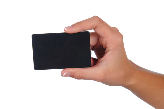 Woman hand hold virtual business card, credit card or blank paper isolated on white background.