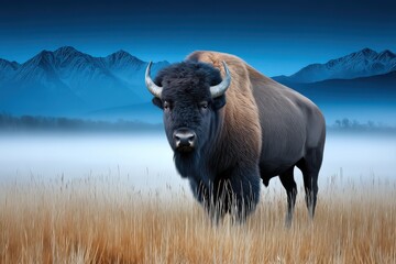Majestic bison stands in golden grass with snow-capped mountains in the background during a serene morning mist