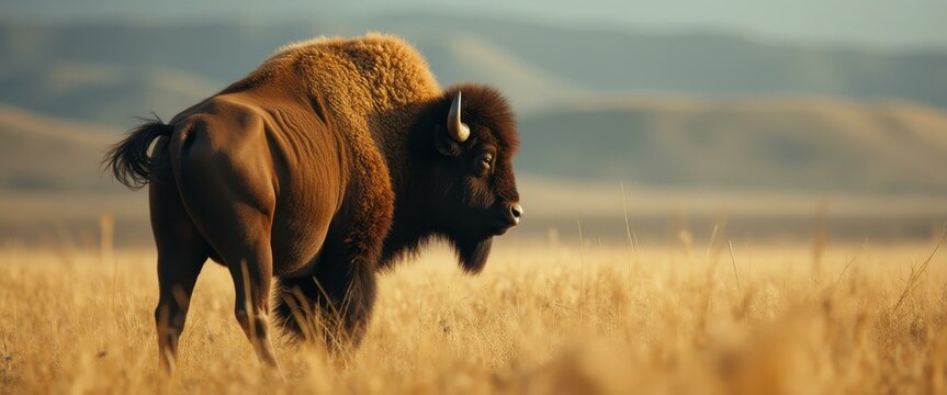 Majestic American bison grazes on a vast plain of tall golden grass, with rolling hills in the background, under the soft, warm li
