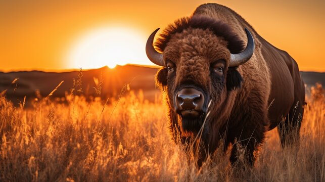 Majestic American bison standing on a golden prairie under dramatic sunset light