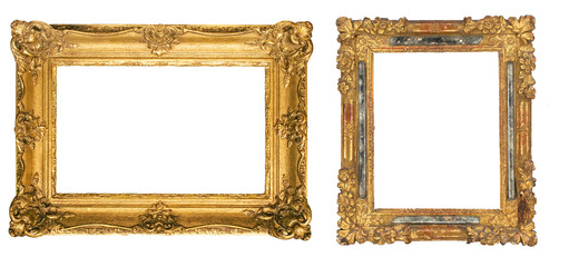 Antique golden frame isolated on white background. Old wooden frame with floral carvings painted with gold paint. Italian heritage and antiquities