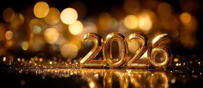 Scene featuring 2026 in bold golden 3D letters heavily defocused background sparkling reflective surface happy new year 2026 merry christmas celebration visualization with copy
