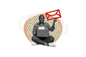 Composite creative art collage of happy american gild hold letter icon message correspondence laptop isolated on painted background