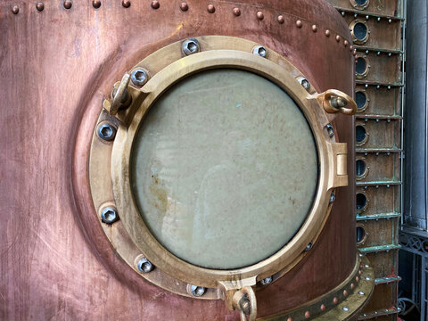 Distillery boiler, close-up of a copper still with a stainless steel agitator taken at a gin distillery.Copy space for your design. Web banner.
