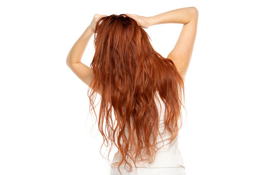 Beauty fashion portrait of beautiful cheerful smiling redhead woman with long ginger hair on white background