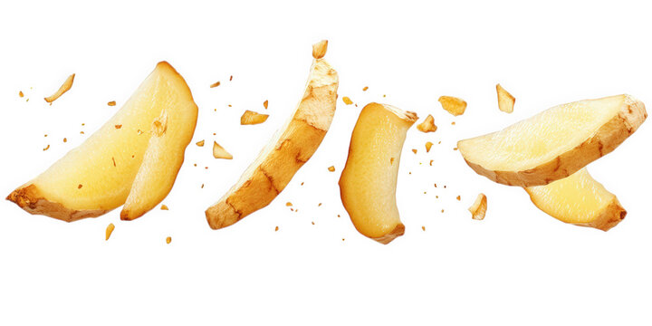 Ginger root, fresh ginger slices, vibrant green leaves isolated on white background, front view, no depth of field, sharp