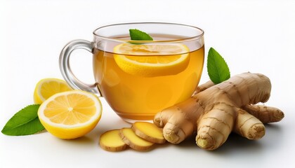 invigorating ginger tea with lemon slices and fresh ginger roots on a bright background isolated on white background