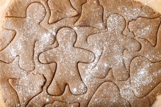 Cooking ginger cookies, Christmas and New Year traditional cookies in shape of gingerbread man, raw rolled out dough with cut out dough figures, closeup texture, top view, pattern on dough, above