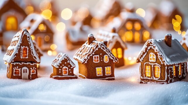 Cozy Christmas gingerbread village town greeting card. Little tiny toy christmas gingerbread village on white snow. Christmas night gingerbread houses on snowy winter light background