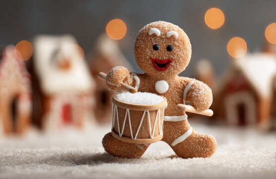 Gingerbread man drumming on snow for holiday music