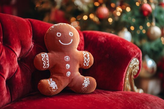 Plush gingerbread man toy sitting on a luxurious red velvet sofa, surrounded by festive decorations, creating a warm and inviting holiday atmosphere with copy space