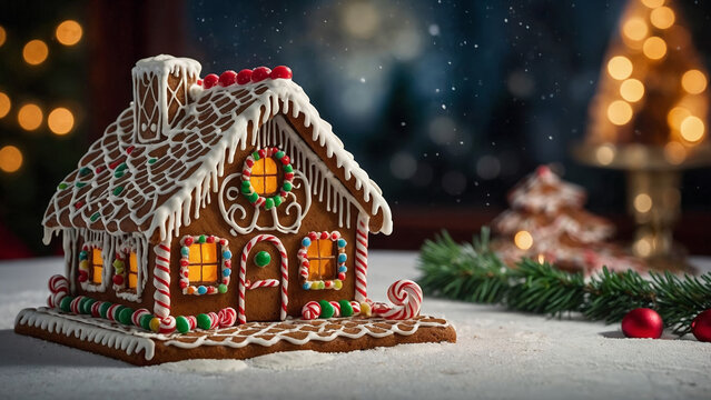 Hanging gingerbread holiday ornaments with falling snowflakes