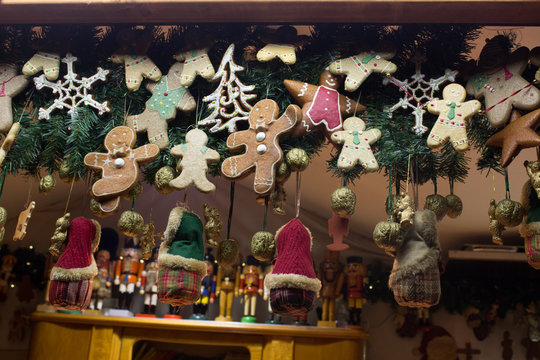 Stuffed toy gingerbread man displayed as awards for winning prizes at London winter wonderland funfair