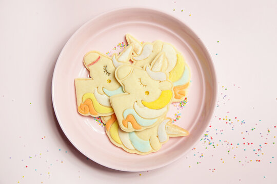 Thin homemade biscuits in unicorn shape. Sugar cookies for children, birthday party, Easter or baby shower.