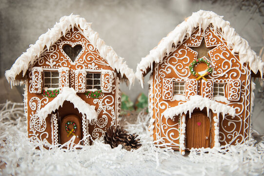 Christmas gingerbread houses on wooden table with bokeh background.. Pastries in the form of houses. Festive scene with holiday pastries. Christmas and New Year background.