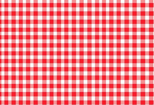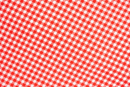 Red and white checkered tablecloth. Top view table cloth texture background. Red gingham pattern fabric. Picnic blanket texture. Red table cloth for Italian food menu. Square pattern of gingham.