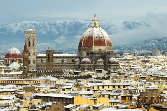 cathedral Santa Maria del Fiore (Duomo) and giottos bell tower (campanile), in winter with snow Florence, Tuscany, Italy