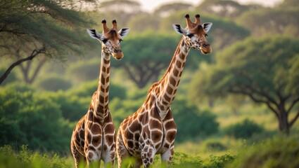 Giraffe Family Stretching to Reach Tender Leaves of Trees in Lush Savanna Landscape